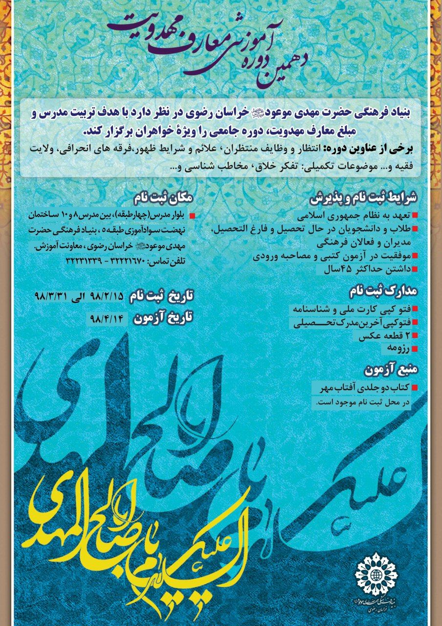 مسئول ثبت نام دهمین دوره معارف مهدویت اضافه کرد: علاقه مندان می توانند برای ثبت نام به بلوار مدرس، بین مدرس 8 و 10 بنیاد فرهنگی حضرت مهدی موعود (عج) مراجعه و یا با شماره 32231339 تماس بگیرند.