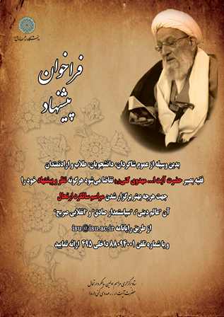 از عموم شاگردان، دانشجویان، طلاب و ارادتمندان عالم وارسته و فقیه بصیر حضرت آیت الله مهدوی کنی(ره) تقاضا میشود هر گونه نظر و پیشنهاد خود را جهت هرچه بهتر برگزار شدن مراسم سالگرد ارتحال این عالم دینی، سیاستمدار صادق و انقلابی صریح از رایانامه isu@isu.ac.ir و یا شماره 88094001 ـ 021 داخلی 495 ارائه کنند.
