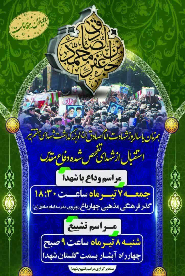 مراسم وداع با شهدا با سخنرانی حجت الاسلام بی آزار تهرانی و نوای کربلایی سیدرضا نریمانی جمعه ۷ تیراز ساعت ۱۸ در گذر فرهنگی چهارباغ برگزار می گردد.