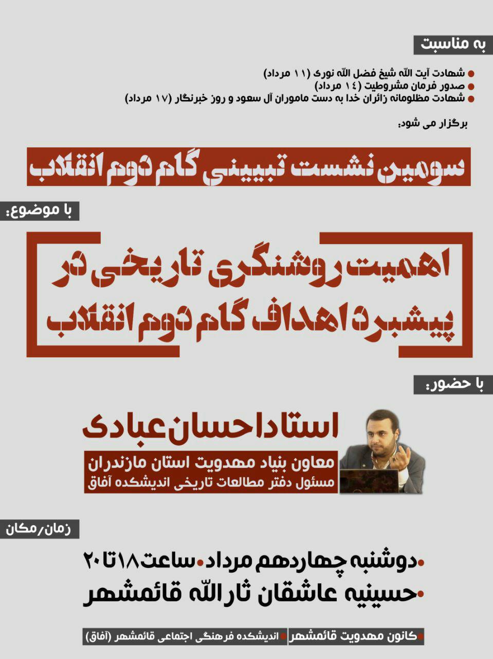 این نشست به مناسبت شهادت آیت الله شیخ فضل الله نوری (۱۱ مرداد)، صدور فرمان مشروطیت (۱۴ مرداد) وشهادت مظلومانه زائران خدا به دست ماموران آل سعود و روز خبرنگار (۱۷ مرداد) برگزار می گردد.