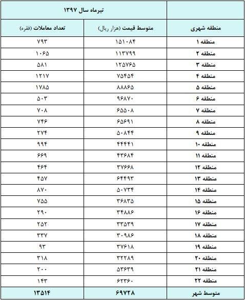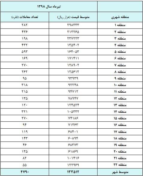 منطقه ۱ تهران در تیر ماه سال گذشته گرانترین منطقه بود با متوسط ۱۵ میلیون و ۱۰۰ تومان و بیشترین تعداد معامله با تعداد هزارو ۶۵ فقره به منطقه ۲ تهران اختصاص یافت. تیر ماه سال جاری همچنان منطقه ۱ تهران با متوسط ۲۹ میلیون و ۸۳۳ هزار تومان گرانترین منطقه تهران است و بیشترین معاملات به منطقه ۵ با تعداد ۵۹۳ فقره تعلق گرفت.