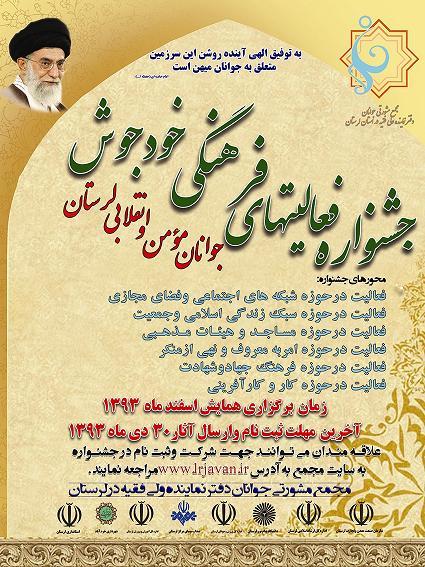 به گزارش حلقه وصل یزدان سهرابی دبیر جشنواره فعالیتهای فرهنگی و خودجوش جوانان مؤمن و انقلابی در گفت و گو با خبرنگار خبرگزاری رسا در خرم آباد بیان داشت: این جشنواره به مناسبت نامگذاری سال به نام «فرهنگ و اقتصاد با عزم ملی و مدیریت جهادی» در خرم آباد برگزار می شود.شرکت کنندگان می توانند تا پایان دی ماه آثار خود را به دبیرخانه این جشنواره ارسال کنند.