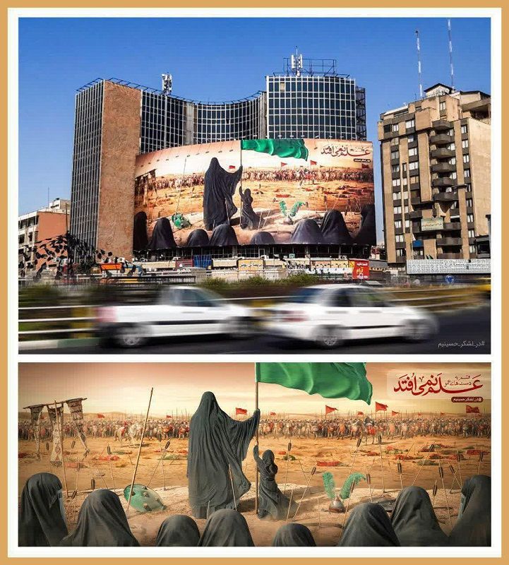 حلقه وصل: چند روز قبل و در آستانه فرا رسیدن ماه محرم و اقامه عزای سید و سالار شهیدان، از جدیدترین طرح دیوارنگاره میدان ولیعصر (عج) رونمایی شد. این دیوارنگاره حال و هوای عاشورایی دارد. آنچه میان كار و در نقطه مركزی توجهها را به خود جلب میكند حضور یك زن و كودك است. هر دو چادر سیاه دارند، رو به میدان جنگ ایستادهاند و زنان دیگری هم با كمی فاصله پشت سر آنها قرار گرفتهاند. همه با هم به روبهرویشان خیره شدهاند. با این تفاوت كه زن و دخترك میان تیرها، نیزهها و كلاهخودهای بر زمین افتاده كه صاحبانشان دیگر شهید شدهاند، ایستاده و انبوه سپاهی را نگاه میكنند كه مقابلشان قد علم كرده است. آنها اما پرچم سبزی را نگه داشتهاند؛ پرچمی كه مردان بسیاری از جانشان گذشتهاند تا افراشته بماند.