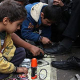 کودکانی که نشانههای فقر در آنها پیداست، به عشق امام حسین(ع)، به زائران کربلا خدمت میکنند و هرچه دارند برس و واکس خریدهاند تا کفشهای زائران را پاک کنند و واکس بزنند.